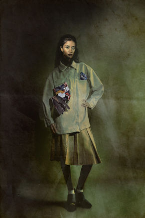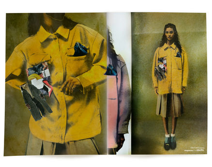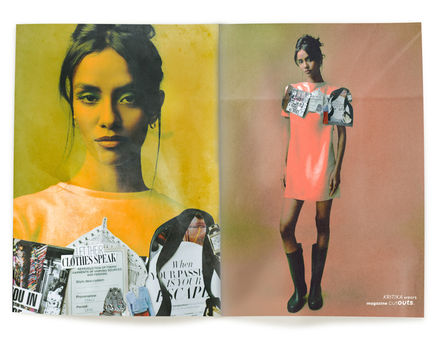She embodies magazine cutouts into her outfits, reflecting how the imagery from magazines grabs our attention and shapes our self-perception. Magazines have long been a medium for expressing individuality, creativity, and cultural identity. As they continuously evolve, they not only influence fashion but also affect how people think and act. This dynamic influence constantly reshapes how we dress, think, and live, making it a powerful tool for personal expression and